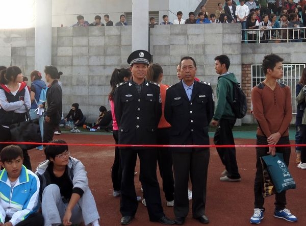 为了更好的了解在校运会期间,校内的安保工作情况,笔者有幸采访到了校保卫处处长卢志勇.卢处长告诉笔者,这次校运会不同以往,为了迎接党的十八大的胜利召开,确保校运会的顺利进行,我校成立了保卫组,并召开会议对校运会期间安保人员的分组情况、工作时间及职责作了安排。保卫组成员会在运动场地间拉起“警戒线”,并在交通路段放置“禁止泊车”等警示牌来加强车辆的管理。此外,为杜绝不明身份的人混入学校,他们还会加强对进出大门的管理,做好来客登记工作。同时,保卫处和宿管科、物业管理部门、医务室以及派出所共同合作,一起为校运会保驾护航。