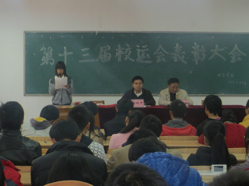 会上,黄书记首先对我院在本届校运会上取得的优异成绩表示衷心的祝贺,并对参加此次运动会的同学提出了表扬。在谈到我院运动员在此次校运会上的不足之处时,黄书记提出了两点希望:一是加强今后的体育训练,二是继续保持对体育运动的热情。黄书记殷切的话语得到在场人员热烈的掌声。随后,各运动员代表相继发言,并表示今后运动一定会做得更好。最后,南老师宣读了此次校运会上优秀运动员的获奖名单,并和黄书记一同为这20名优秀运动员颁奖合影留念。