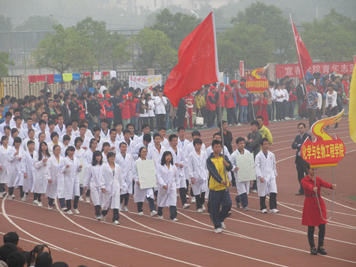 8点30分,一切准备就绪,我校第十四届校运会拉开了序幕。我院代表走方阵的同学昂首挺胸,斗志昂扬,迈着矫健的步伐,开拓创新,别出心裁,“放飞化生的梦想,挥洒青春的活力”是我们的口号,让人心潮澎湃。