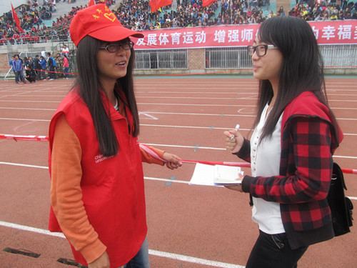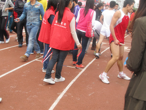 11月1日上午,开幕式结束后,运动员的比赛就开始了,青年志愿者的工作也随之展开了。其中我院的青年志愿者的代表队代表着我院以及我院的青年志愿者协会。一条长长的红带,牵连着众多个志愿者的辛勤汗水和热情执着。他们顶着炎热的太阳,嘴唇晒得发黑,脸上几乎没有一点水色,可他们却是依然坚挺了下来,直到运动员散场的那一刻。当记者来到一位发黑的嘴唇的志愿者身边。据了解,原来她是来自化生的一名志愿者——李梦茹。她告诉记者:“我是化生的一名志愿者,因为自己没有运动项目,所以就加入了校青协志愿者的活动,虽然很辛苦,但是很开心。能作为志愿者为我院争光。明天上午还有一上午的志愿服务,我希望我能更好的表现,做好自己的志愿者的活动,为他人所需服务。”