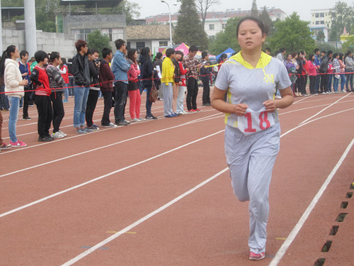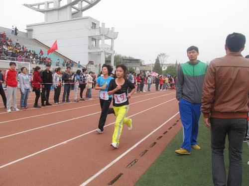在比赛过程中,有些运动员在中途已经脸色发白、呼吸急促,但坚持信念的她们依然咬紧牙关、奋勇直追;还有些运动员因体力透支而被迫停歇,但经过短暂的呼吸调整后继续拼搏。当比赛进入到最后一圈时,很多观众都站起来为运动员们鼓掌加油,直到最后一名运动员跑到终点,掌声还迟迟不停。经过激励的角逐,最终,我院13化教班袁花花获得了此次比赛的第八名。