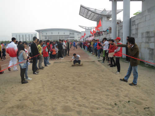 比赛现场,周围围满了观众,观众的当中拉拉队大多是我院学子,都纷纷前来为老师鼓劲助威,12药学班黄志松说道:“我们是来为周老师与南老师加油的,我们都很期待他们的精彩表现,无论比赛结果如何,他们在我们心中永远是最棒的,我们为他们感到骄傲幸福。”赛中,南老师与周老师面带微笑,轻装上阵。助跑,甩手,起身,跳!天空划过一道道优美的弧线,沙坑留下一个个深深的脚印。最终周老师以