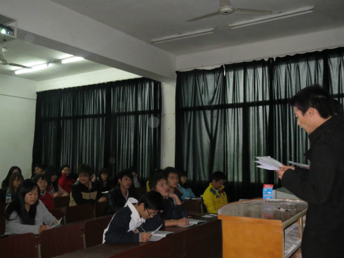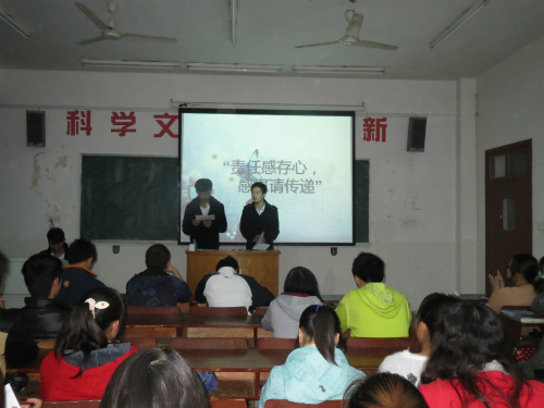 本次活动共分感恩视频欣赏、感恩知识抢答、感恩故事传递和班会总结四个环节。活动开始,同学们一起观看了“责任、感恩”视频《父亲》,大家对视频中的故事情节感受颇深,不禁溢出了眼角的泪水。随后,在感恩知识抢答环节中,当主持人问到如何表达感恩时,同学们积极参与、踊跃发言。其中,该班团支书龙杏圭谈到:“感激父母的养育之恩,是他们用责任和真情来教育我们,让我们学会感恩;感激老师的教诲之恩,是她们以渊博的知识让我们懂得什么是责任、什么是感恩;感激同学的好心帮助,是他们用真挚的感情让我体会到了怎么去承担责任、怎么去感恩”,赢得了同学们热烈的掌声。