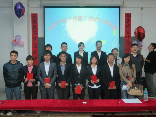 (学生通讯员 李笑轩 叶智鹏)11月21日晚,我院在人文楼成功举办了以“感恩”为主题的演讲比赛。我院党总支副书记黄良辉,团总支书记南建忠,辅导员老师邹立亮、李婷等出席并担任此次比赛的评委,我院近200名学生代表观看了本次比赛。