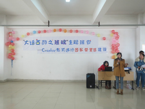 (学生通信员朱琳燕叶智鹏)11月27日中午,我院在二教楼举办了以“大话西游”为主题的班会活动。我院辅导员老师李婷出席并与12级全体班委共100余人参加了此次活动。