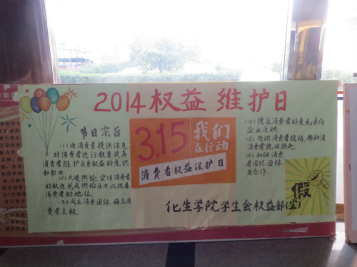 这一系列维权活动,吸收了我院广大学生的目光,许多同学都表示,近年来网络上不断曝光问题食品的现象,从染色馒头、三鹿牛奶,再到双汇集团,以及依然猖狂的地沟油,无不提醒着我们要勇于维护自身合法权益的意识。其中,来我院12药学班的王松同学说道:“我以前就注意了解一些相关法律,因为不想做受害者嘛!”他还建议到,学校相关组织单位可以多开展些维权活动,帮助大家加强对相关知识的认知。