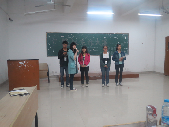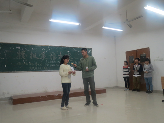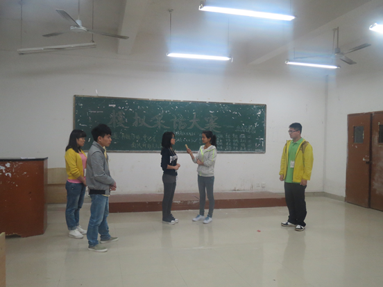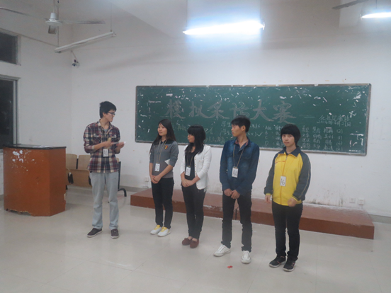 本次比赛分为场外十分钟准备、现场七分钟模拟采访两个环节,并将参赛选手分为A、B、C、D四个小组进行。在比赛过程中,各组扮演小记者角色的选手以其独特的方式对被采访者进行了现场模拟采访,被采访者则以其灵活的应变能力就小记者提问进行了巧妙的回答。逐渐的,场上紧张激烈的气氛愈演愈烈。最后,B组成员凭借着敏锐的观察力、组员的通力合作与对所模拟人物心理、言语的把握,将昆明火车站事件更加形象的演绎在评委面前,赢得评委一致好评并获得此次比赛的最佳团队奖。