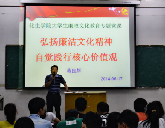 (学生通讯员 林慧超 杨琪)6月17日晚,我院在逸夫楼开展了一次以“弘扬廉洁文化精神,自觉践行核心价值观”为主题的大学生廉洁文化专题党课教育活动。我院党总支副书记黄良辉担任此次党课的主讲人,近300名学生党员、预备党员和入党积极分子一起聆听了一堂生动的廉洁文化专题教育党课。党课由我院团总支书记南建忠主持。