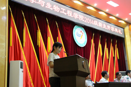 会上,教师代表韩成云博士作了发言,她用激情的话语告诉同学们,人生的意义在于自我价值的实现,进入大学的校门,新的舞台将在这里开始,要规划好自己的蓝图,敢于拼搏。“人间春色本无价,笔底耕耘总有情”,老师们也会秉着爱岗敬业的信念,严以律己、为人师表,与同学们共同进步,给国家、社会、家人一份满意的答卷。紧接着, 12食品质量与安全班洪涛作为老生代表,用自己的经验向新同学们提出了中肯的建议。大学的生活由自己创造,青春的舞台由自己挑战,要保持好心态,树立明确的目标,热情的工作,热情的生活,将会收获更多的美好。而后,14药学班李梦婷作为新生代表进行了发言,她向同学们阐述了刚来到大学的所感所想和对未来的无限憧憬,大学是新的起点,要认真规划好大学四年的生活,让梦想在这里扬帆起航。最后,典礼在一片热烈的掌声中序幕。