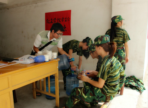 在这酷热的天气里,我院红十字会每天都安排志愿者在服务点进行服务,为军训的新生免费提供桶装水和解暑药品,让新生们的安全在军训中得到保障。在提供志愿服务的同时,志愿者们还会热心的提醒道:“如果你们发觉自己有头晕的现象,要立刻到我们志愿者服务点,我们会为你们提供药品与帮助”。在整个军训期间,志愿者们都以积极热情的姿态,为需要帮助的新生提供适当服务,为我院安全、和谐的新生军训奉献了自己的一份力量。