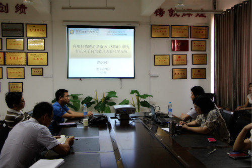 报告会上,曾庆祷教授介绍了扫描隧道显微术的应用和研究方向,详细阐述了利用STM技术研究单分子组装结构的表征、主客体超分子化学以及表面化学反应追踪等现象。曾庆祷教授以清晰的思路、简易的语言,将深奥的理论与听众的实际学术背景相联系,深入浅出的讲解使师生们受益匪浅。报告会后,曾庆祷教授就在场师生们提出疑问作出了详细的解答,并与我校、院领导进行合影留念。
