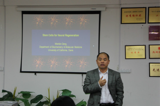 讲座中,邓文斌教授以“干细胞技术与新药开发的前言介绍”为主题,向与会者详细阐述了胶质细胞前体在神经损伤疾病修复中的作用,以及以干细胞,IPS细胞为模型进行药物筛选从而治疗中枢神经系统损伤疾病,他将理论研究与其在医药研究过程中解决的问题相结合,例证结合,开阔了大家的视野与思路,使在座师生都受益匪浅。讲座结束后,邓教授与在座的师生进行了深层次的讨论与交流。