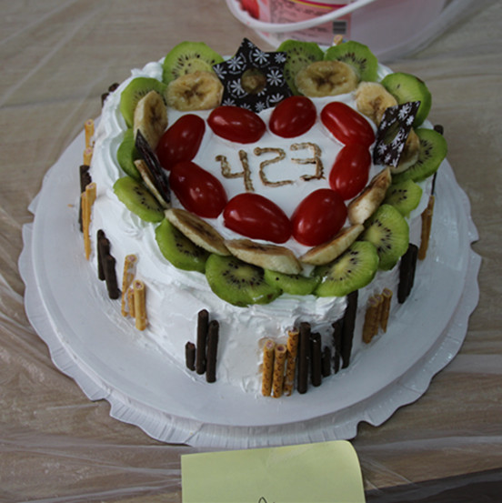 此次比赛分为两组进行,每组要在40分钟内完成作品。比赛从作品的“创意方案,色调搭配,材料奢俭”等方面综合评分。首先,叶文峰老师发表讲话,她说道:“此次比赛主要为了提高同学们学科知识的丰富程度,加强操作技能以及动手能力的应用,希望大家能从中收获别样的快乐。”接着,叶老师宣布比赛正式开始。比赛中,每组队员充分发挥自己的想象,各式各样的蛋糕层出不穷。其中,12食品班用圣女果,香蕉等简单的材料拼出了六颗层层包围的心,心中刻下了他们的寝室号“423”,这代表着他们寝室六人之间深厚的友谊。最终,这份“友谊”也荣获了此次比赛的桂冠。