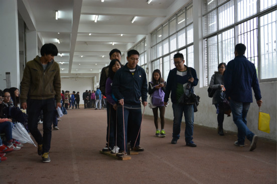 (学生通讯员 邓艳梅)11月7日,阴雨连绵,而赛场上的运动员们依旧进行着比赛。上午11:30分,青年教职工“板鞋竞速”正式拉开了序幕。在田径场室内运动场开始了第十五届校运会青年教工组三人“板鞋竞速”比赛,我院南建忠老师,葛军英老师,周兰姜老师积极参与并取得了不俗战绩。