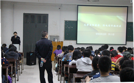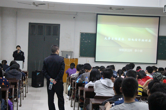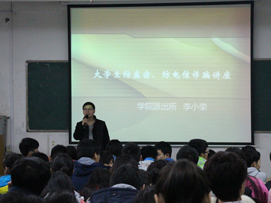 (学生通讯员 刘旦 苏娴洁)在这个信息飞速发展的时代,为了提高大学生安全防范意识,防止上当受骗、盗窃事件的发生,3月30日晚,我院特邀请我校指导员李小荣警官、陈珑警官在人文楼作了安全知识讲座。我院团总支书记南建忠老师担任主持并同我院全体新生聆听了此次讲座。