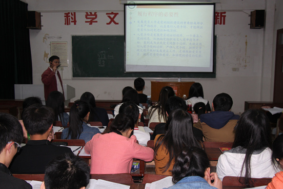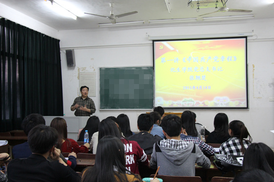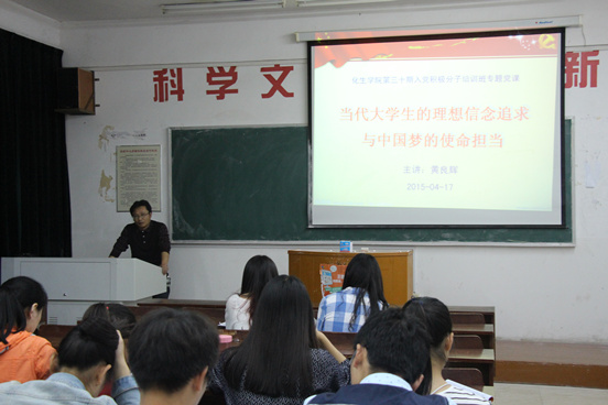 为了进一步提高学生入党积极分子的思想觉悟和责任意识,4月16日和17日晚,我院党总支副书记黄良辉分别以《当代大学生应当自觉践行社会主义核心价值观》和《当代大学生的理想信念追求与中国梦的使命担当》为题,为培训班的同学们上了两堂精彩的党课。他结合党的十八大、十八届三中四中全会以及习近平总书记重要讲话精神,详细阐述了社会主义核心价值观和中国梦的科学内涵、现实背景、历史渊源、实践要求等内容,阐明了坚定理想信念、树立正确的人生观价值观对当代大学生未来发展的重要性。要求学员们时刻牢记党的宗旨,牢固树立中国特色社会主义共同理想,自觉践行社会主义核心价值观,在日常学习、生活和社会实践中从我做起,从严要求,发挥模范带头作用,加强党性修养和锻炼,勇于担当起实现伟大中国梦的历史责任。