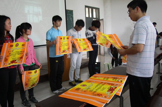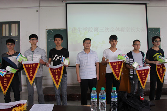 会上,主持人公布我院“三月份流动红旗评比”的20个优秀寝室和我院第十届寝室文化节的11个获奖寝室,并由南建忠老师分别为其颁发流动红旗和奖状。其中,19栋309寝室以其别具一格的诗文布局和浓厚的书香气息,获得本次活动“最佳风格设计奖”。阵阵掌声过后,南建忠老师发表讲话。首先,他对获奖寝室表示祝贺,希望大家再接再厉,争先创优。随后,他指出,近期,学院以构建和谐、文明、整洁的寝室环境为出发点,严厉查处学生携带快餐盒、宣传单进入寝室的行为,呼吁学生走出寝室,在学校食堂完成餐饮,希望同学们严格要求自己,积极配合工作,并鼓励大家在“校领导接待日”对食堂、寝室的文明建设积极提出意见。