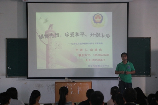 9月11日下午,由我院团总支书记南建忠主讲的“纪念抗战胜利70周年专题讲座”围绕“铭记历史,缅怀先烈,珍爱和平,开创未来”这一主题开展,南建忠老师旁征博引,通过大量的史料并结合一些影视视频,为在场的新生们再现抗日战争的这段历史。他通过淞沪会战、南京保卫战的抗战史实,从战争的进程、战争的结果与历史的经验教训等方面为新生们作了深刻的阐述。
