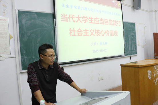 随后,黄良辉同志为入党积极分子作了题为《当代大学生应当自觉践行社会主义核心价值观》的首场讲课。黄良辉同志从社会主义核心价值观的含义出发,结合当代大学生的历史责任和社会时事,就社会主义核心价值观在历史上渊源、提出的现实背景、价值本质等方面,做了深入浅出的讲解。同学们认真听讲,并认真做着笔记,营造了良好的党课学习氛围。