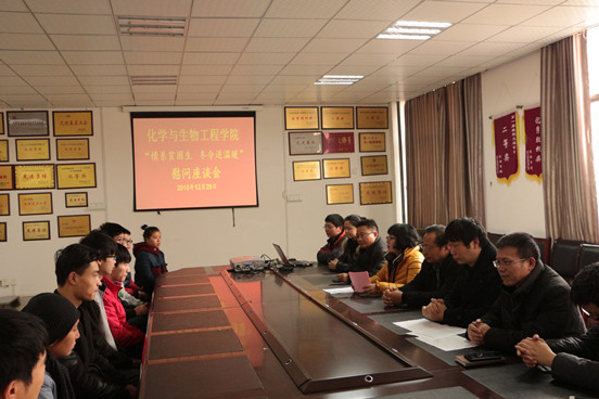 本站讯 为了体现学校对贫困学子的关怀与温暖,12月29日上午,在新年元旦来临之际,我院在院会议室举行了“情系贫困生,冬令送温暖”元旦慰问座谈会,我院院长郭孟萍、副院长熊知行、易剑峰、党总支副书记黄良辉、学工科长晏细元、团总支书记南建忠及部分班主任老师与接受慰问的8名贫困学子代表进行了亲切座谈。座谈会由黄良辉主持。