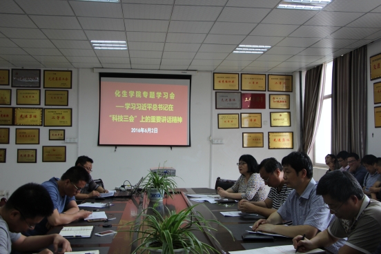 (化生学院供稿) 6月2日下午,我院在院会议室召开教师专题学习会,集体学习习近平总书记在全国科技创新大会、两院院士大会、中国科协第九次全国代表大会上发表的《为建设世界科技强国而奋斗》的重要讲话精神。我院院长郭孟萍、副院长熊知行、易剑峰、院党委副书记黄良辉和全院教师参加了学习会,会议由黄良辉主持。