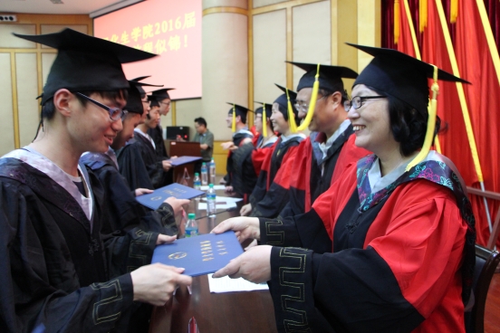 大会举行了毕业证书和学位证书颁授仪式。毕业生们身穿学士服、头戴学士帽,一一上台接受证书,院领导和教授们亲切的为毕业生拨正流苏。