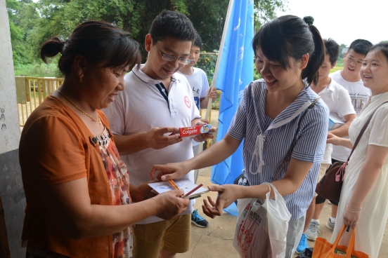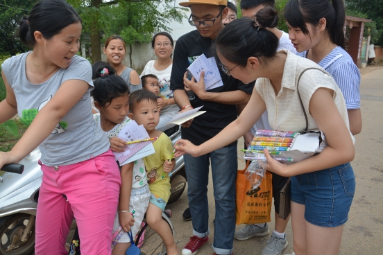 7月9日清晨,实践队的队员们满怀激情踏上了前往樟树市经楼镇小南村的爱心之旅,经过三个多小时的颠簸,队员们顺利到达了小南村,受到当地老乡的热情欢迎。当日中午开始,队员们就冒着酷暑走家串户了解全村儿童情况,为当地村民免费发放蚊香、牙膏等日常生活用品,给孩子们发放了铅笔、卷笔刀、作业本等学习用品,并告知乡亲们和孩子们此次实践队以关爱留守儿童为主要内容的活动安排,瞬间拉近了与乡亲们孩子们的距离,为本次活动顺利开展打好了宣传基础。