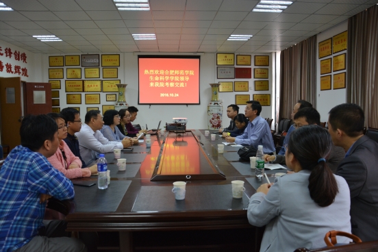 (学生通讯员 陈百顺 史超玉)10月24日上午,合肥师范学院生命科学学院院长徐忠东、副院长朱桂兰及相关系(部)负责人一行7人,来我院院进行考察交流。我院院长郭孟萍、副院长熊知行及相关科室负责人和教师代表一同热情接待了客人,双方进行了亲切的座谈交流。