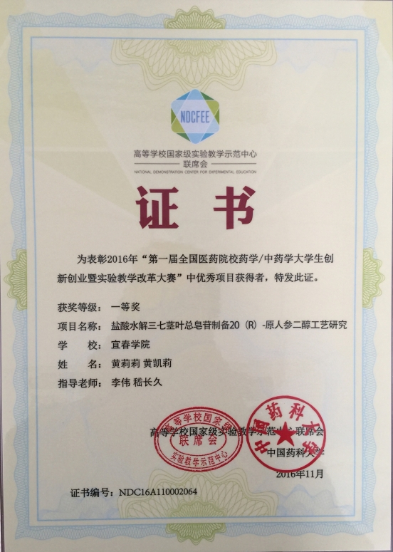 据悉,本次大赛由高等学校国家级实验教学示范中心联席会主办,中国药科大学承办,旨在进一步提升全国医药院校药学、中药学专业大学生创新创业能力,鼓励大学生开展面向实际应用的创新创业活动,要求参赛项目所涉及的技术或产品具有创新性和潜在产业化应用价值。大赛分为学生创新创业组和教师实验教改组,共有117个项目参与角逐。在函评环节中,我院代表队参赛的研究项目《盐酸水解三七茎叶总皂苷制备20(R)-原人参二醇工艺研究》体现出的创新性、综合性及合理性,得到了评委们的高度肯定。在答辩环节,两位参赛同学从容不迫,思维敏捷,应答自如,给人留下了深刻印象。最终,我院参赛项目荣获学生创新创业项目竞赛一等奖。
