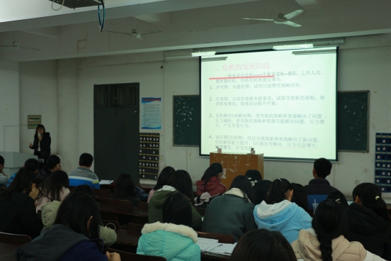 李婷老师用真实的事例,就大学生心理危机干预的基本理论与心理危机干预工作流程两个方面向同学们讲述了什么是心理危机和人生有哪些危机,生动形象地说明了大学生心理危机的表现及危机的发展阶段。同时希望寝室长能及时发现宿舍同学的心理危机状况并及时向心理委员和老师反映。