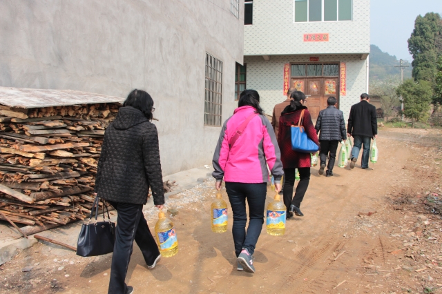 随后,在驻村第一书记郑利华老师和村干部陪同下,大家一同走访慰问了结对帮扶的同光村民小组的5户贫困户,给他们赠送了一些粮油和大米慰问品,以表达学校及全院师生对他们的温暖和关怀。走访过程中,每到一户都和他们亲切交谈,详细了解他们的生活困难情况和致贫原因,并做好详细记录,同时鼓励他们对生活要充满信心,在党和政府以及学校的关怀和帮助下,通过自身努力,争取早日脱贫致富奔小康,过上幸福美满生活。