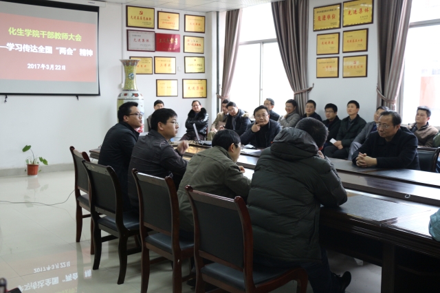 (化生学院供稿)3月22日下午,我院召开干部教师大会,传达学习全国“两会”精神和习近平总书记重要讲话精神,贯彻落实中央、省委、市委和校党委的决策部署。我院全体干部教师参加了会议,会议由院党委书记黄良辉主持。