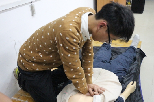 活动伊始,南老师作为主持人,用生活中具体实例告诉我们学习救援知识的重要性,以此激励学员们用心学习。随后,曾璐为大家讲解和演示外伤包扎技术。她向大家介绍了绷带包扎和三角巾包扎两种包扎方法,并一一演示环形、螺旋、反螺旋、“8”字等不同样式的绷带包扎和三角巾包扎中头部、胸部、手臂不同部位的包扎操作程序,在主讲人耐心的讲解和演示下,学员们踊跃参与并能准确地掌握动作要领。接着,邹涛在讲解的同时用假人做实体演练,为确保培训的成果,大部分学员上台体验并掌握了按压和人工呼吸等心肺复苏的操作方法。