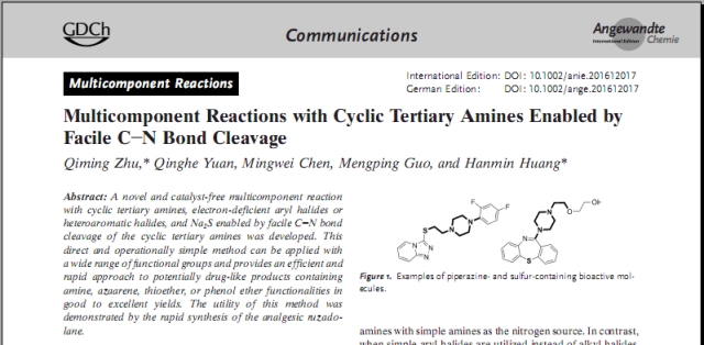 日前,我院朱其明博士领衔的课题组传来喜讯,课题组潜心开展的化学领域前沿性课题——新型多组分反应的研究工作取得突破性进展,其研究成果《Multicomponent Reactions with Cyclic Tertiary Amines Enabled by Facile C-N Bond Cleavage》,公开发表在化学界国际顶级期刊《德国应用化学》上(Angew. Chem. Int. Ed. 2017, 56, 5101—5105),该期刊SCI影响因子为11.7,这是迄今为止以我校为第一作者单位发表的SCI影响因子最高的学术论文,体现了我校在化学有机合成、药物合成领域的创新研究实力和领先水平。