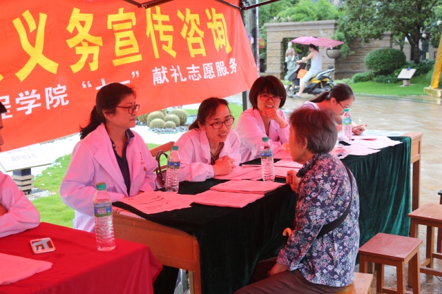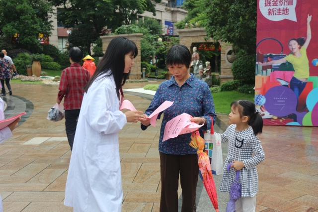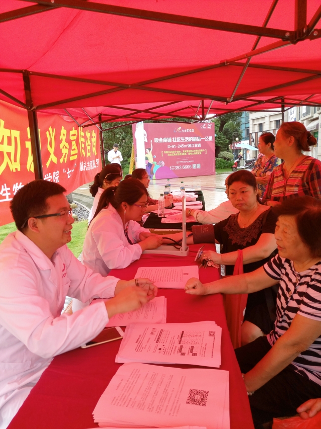 当天上午,服务队冒着绵绵细雨来到碧桂园居民小区门前设立咨询服务点,热情接待小区居民的咨询,现场解答市民有关疾病预防与健康方面的疑问,为居民义务测量血压,宣传普及有关食品药品安全和常见疾病预防等方面的健康知识,受到了小区居民的欢迎和称赞。