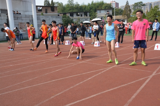 比赛开始,现场人满为患,各运动员在自己的道上作着准备活动,高抬腿、跨步跑、压腿、活动腰......发令员喊“各就位”了,运动员们都在自己的道上做好起跑姿式,两手放在起跑线后,左脚跪地,发令员一声“预备”,只见他们重心前移,左腿前弓,又腿也已离地,微弯成135度夹角,随着一声枪响,但见一条黑影像离弦的箭似的,一下就冲了出去。定睛一看,只见运动员们那两条腿像风火轮一样,根本看不清他们换腿,手摆臂有力度,幅度适中,手摆到离下巴一拳的地方停下、收回,频率快,很快就到达了终点,在这短短的十几秒里,他们中结束了这100米的短跑。最后,我院取得第五和第七的成绩。
