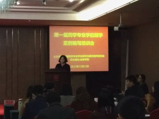 随后,邵蓉教授代表全国药学专业学位研究生教育指导委员会发表讲话。她说,宜春学院对于她而言有着深刻的印像,特别是该校对药学硕士专业学位研究生培养的重视;紧接着,她谈到了全国药学专硕的规模与发展,通过各种的规划与标准的制定,从原来的39家药学专硕的培养单位增长到74家,为了更好的开展药学专业学位研究生的培养,举办了这次案例编写培训,希望老师们能在案例入库的工作中继续提升编撰水平,提供更多编写者原汁原味的编写思路,使得更多案例能够源源不断的入库,对此她引出本次会议的目的:希望通过本次会议中已经入库专家的演讲,在场的其他专家能够学会他们的药学专业学位案例编写的思路,为药学专硕培养提供更多更好的案例。