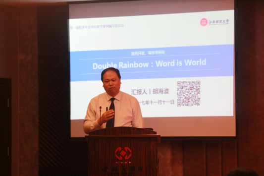 胡海波教授以“Double rainbow:Word is world”为题作报告,以现有案例“茅台酒”为例子对案例的开发作了具体阐述;他认为案例的开发主要就是写作与研究,并针对此提出自己的看法:科研团队作为基础,案例资助作为机制,百优案例作为抓手及活动开展作为一个平台,一步步一环环去打造好属于自己团队的案例。
