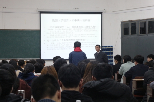 胡教授从《资治通鉴》中任座直言、宋弘念旧的故事讲起,告诉同学们做人需要秉承三种态度:正直、包容、智慧,同时也要学会感恩,感恩是立人之本。他博古论今,引经据典,立足当下,放眼未来,阐述了新时代大学人才培养的基本内涵——人格塑造和知识传授,以及师道的,认为一所好大学应当培育出人格完善、品学兼优的合格人才。同时,他重点从新时代建设中国特色社会主义和实现中华民族伟大复兴中国梦的高度,分析阐释了当代大学生理应肩负的神圣使命及应具备的基本素养,强调大学生要有强烈的责任担当精神,要树立求真务实的学风,要不断丰富自己的文化涵养,做一个勇于担当、眼界开阔、文理兼修、博学多能的大学生。他希望同学们要树立远大理想与抱负,坚定中国特色社会主义信念,牢记使命,发奋努力,将来为建设中国特色社会主义和实现中华民族伟大复兴中国梦贡献自己的青春和力量。