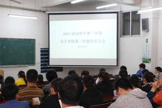 (学生通讯员 刘淑云 王磊) 为推动学生宿舍环境卫生整治和寝室文化建设,营造良好的寝室文化氛围,4月9日,我院在人文楼大教室召开了本学期第三次寝室长大会。会议由我院辅导员彭勃老师主持,全院寝室长100余人参加了会议。