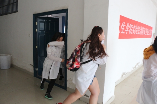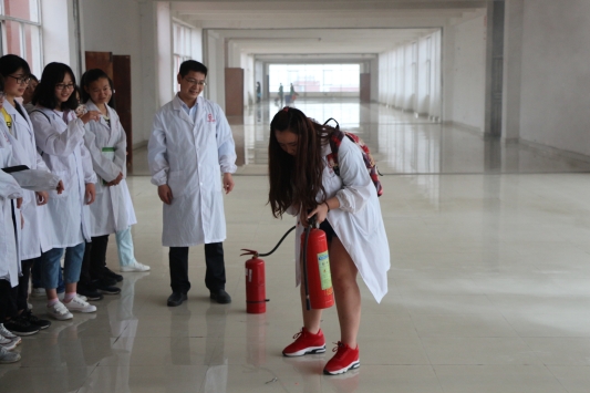 演练开始前,南老师向同学们详细讲解了灭火器的使用原理以及相关的注意事项,并亲自展示了灭火器的使用方法。在认真听讲及学习后,学生们亲手体验了一下灭火的过程:先拨去保险销,一只手握住喷嘴,另一手提起提环,按下压柄喷射。随后,南老师结合实际讲解了火灾发生时应采取的措施。最后,同学们进行了逃生演练,在南老师的指挥,同学们捂住鼻子、弯下腰,紧张有序的跑到了安全场地。