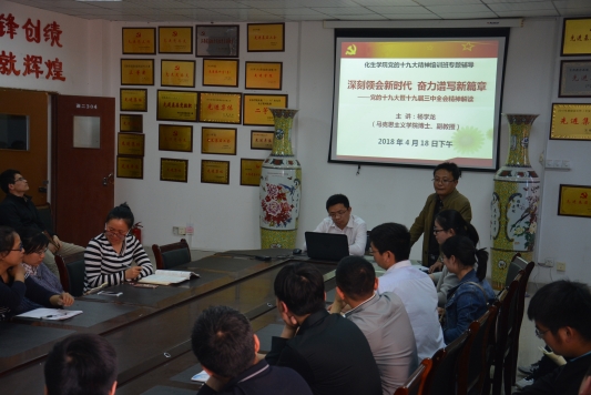 (学生通讯员 许虎文 谢姝钰)为推动学习彻贯彻党的十九大精神,按照上级及学校党委关于在全体党员中开展学习贯彻党的十九大精神集中培训的工作要求, 4月18日下午,我院党委组织开展了一次党员学习贯彻十九大精神培训专题辅导党课,特邀我校马克思主义学院副教授杨学龙博士作了题为《深刻领会新时代 奋力谱写新篇章——党的十九大暨十九届三中全会精神解读》的专题宣讲。我院院长郭孟萍、院党委书记黄良辉及全体师生党员100余人参加了本次专题党课学习。