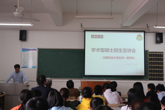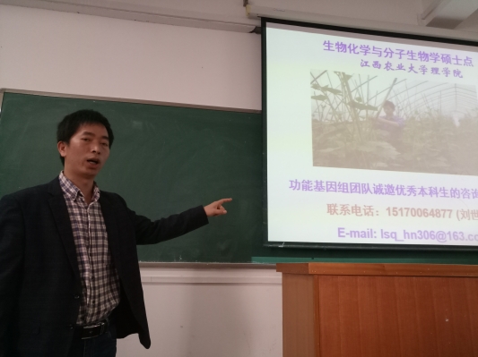 随后举行了研招宣讲会,周阳书记一行面向化生学院和生科学院2019届考研学子进行了研究生招生专题宣讲。周书记及各位硕导分别就江西农大理学院三个硕士研究生招生专业(化学、生物化学与分子生物学、生物物理学)的专业特色、研究方向、师资力量、培养条件及优惠政策等内容,向同学们作了详细介绍和现场答疑,鼓励并欢迎同学们报考江西农大的硕士研究生。