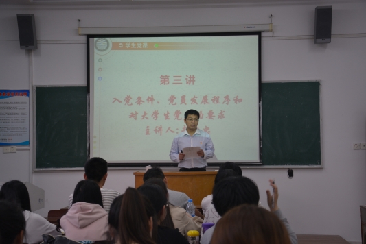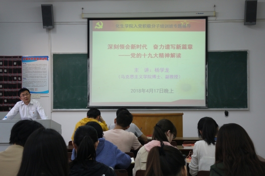 4月18日晚,南建忠老师为培训班学员解读了入党条件、党员义务和责任、党员发展程序及对大学生党员的基本要求,使同学们了解入党条件,明确了入党程序,加深了对党的认识。