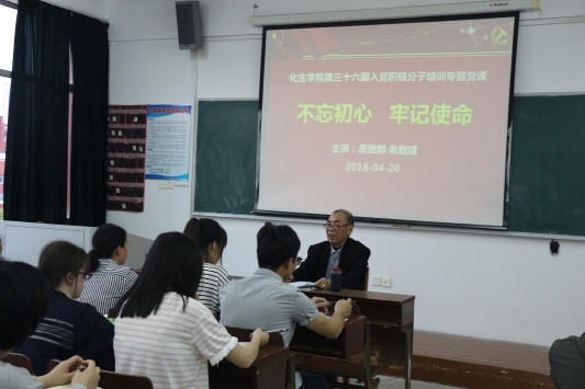 4月19日晚,我校关工委副主任、年逾八旬的皮建群老教授以《不忘初心,牢记使命》为题,为培训班学员作专题授课,阐述中国共产党成立的历史渊源和理论基础,引导同学们在重温党史中汲取奋进新时代、奋斗新征程的力量,加深了同学们对党的光辉历程和历史使命的了解和认识。