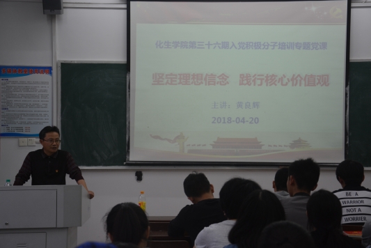 4月20日晚,此次入党积极分子培训班第五堂党课由黄良辉书记主讲。他以《坚定理想信念,践行核心价值观》为题,向同学们全面阐述了共产党人的理想信念与价值追求,强调了入党积极分子树立理想信念的重要意义,希望同学们时刻牢记党的宗旨,勇于担当时代责任,模范践行社会主义核心价值观,为实现中华民族伟大复兴的中国梦贡献青春和力量。