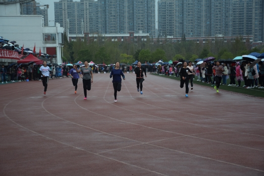 百米组的比赛尤为激烈,各院短跑精英皆汇聚于此。当个运动员皆起跑准备就绪后,发令员一枪令下,运动员们便如箭一般飞奔出去,刹那间整个赛场便沸腾起来,紧张的气氛弥漫在赛场的每一个角落,看台上及跑道周围的观众纷纷为选手加油呐喊。每位运动员都竭尽全力向终点奔去,努力将自己与对手之间的差距拉小,最终来自我院的何慧权及罗倩以极佳的起跑和加速,分别获得第二和第三名。