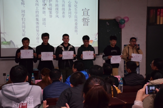 在现场师生的见证下,本学期班级工作量化排名前三的班级与排名靠后的三个班级彼此结成了帮带共建关系,并立下了军令状。然后由“最佳人气班长”16生工班班长崔宇同学带领全场班干部进行了庄严的集体宣誓。