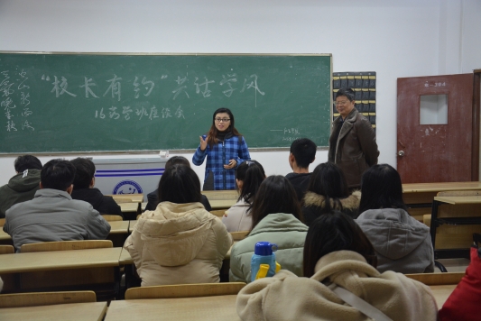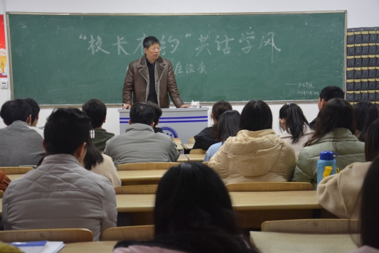 作为该班的第二班主任,邱校长时刻关注着同学们的学习生活状况。在座谈会上,他首先向同学们提出了两个问题:“同学们觉得三年的大学生活怎么样”、“自己该有什么样的目标”。面对邱校长的问题,同学们纷纷举手发言,表达自己的想法。邱校长听完后,对他们的发言进行一一总结,并以诗句“空山新雨后,天气晚来秋”为引,向同学们谈及学习及生活上的哲理,引发同学们对自身人生目标、未来发展方向进行思考。继而,邱校长向同学们强调到在明确自身目标之后无论怎样发展,都要坚守本心,要先计划好自己前行的道路才能走得更远。在会议的最后,李婷老师对邱校长所讲进行了简略的总结且向邱校长介绍了16药学3班的基本情况,同时鼓励同学们认真复习诚信应考。