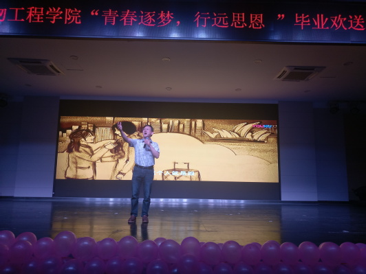 晚会在一段精彩的开场舞蹈下拉开序幕,随后,主持人介绍了出席本次活动的领导老师并宣布晚会正式开始。陈运鹏一首《等你下课》的独唱歌曲,带动着现场观众的热情。接着,由院学生会成员带来创新类节目《影舞飞扬》,表达了对毕业生们的美好祝福。黄皓教授演唱的一首《母亲》,歌声蕴含了毕业学子对母校的感恩之情,感染全场。小品《上学那些事》、《我们的四年》、《青春校园》,勾起毕业学子对四年校园生活的难忘记忆。毕业生钟帅的独唱《未完成的歌》和祝丽、孙祎昕等同学表演的舞蹈《思慕》《dalla dalla》,洋溢着青春的气息,抒发了奋进的情怀。最后,晚会在鼓舞人心的师生大合唱《大学问》的歌声中圆满落幕。